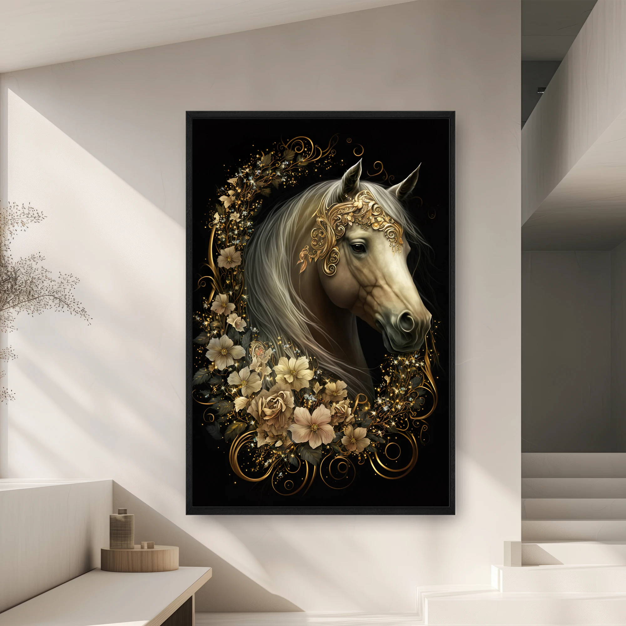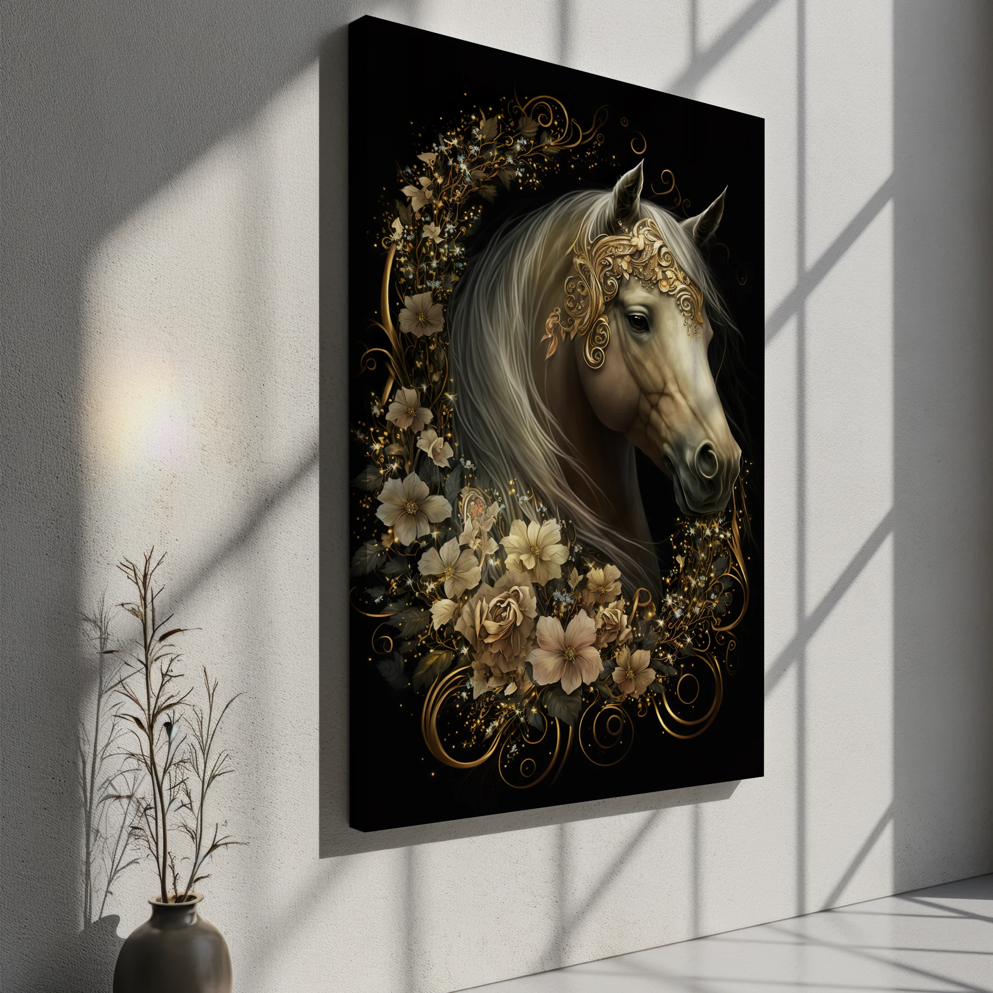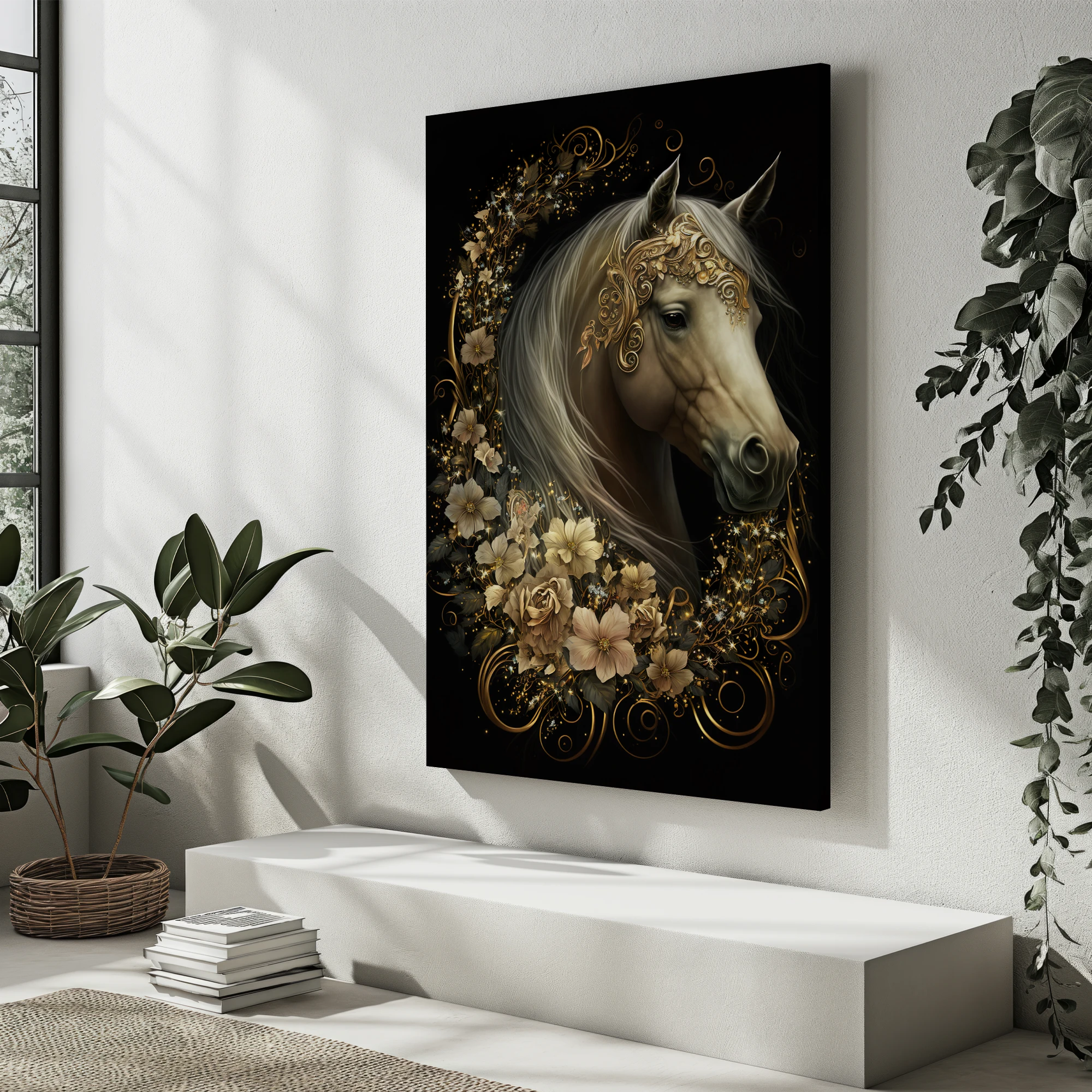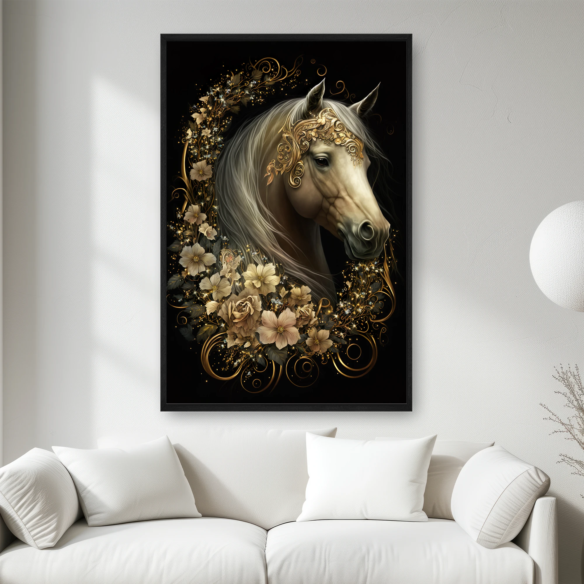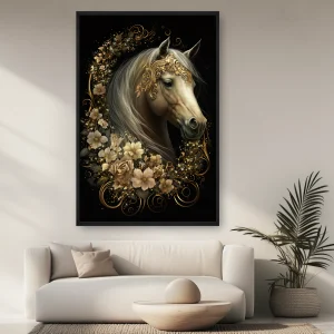 Etrafında Altın Yeleği Ve Çiçekleri Olan Beyaz Bir At