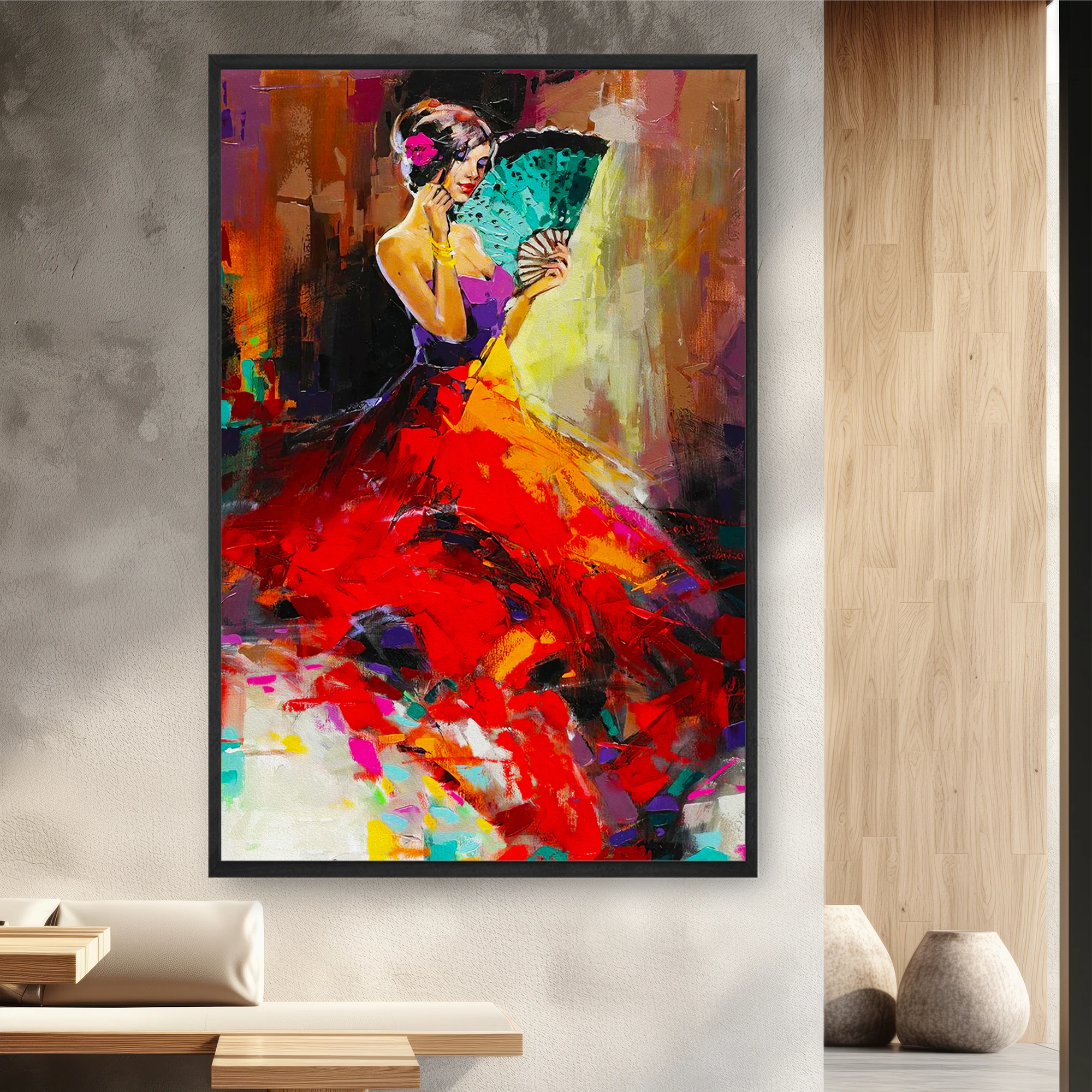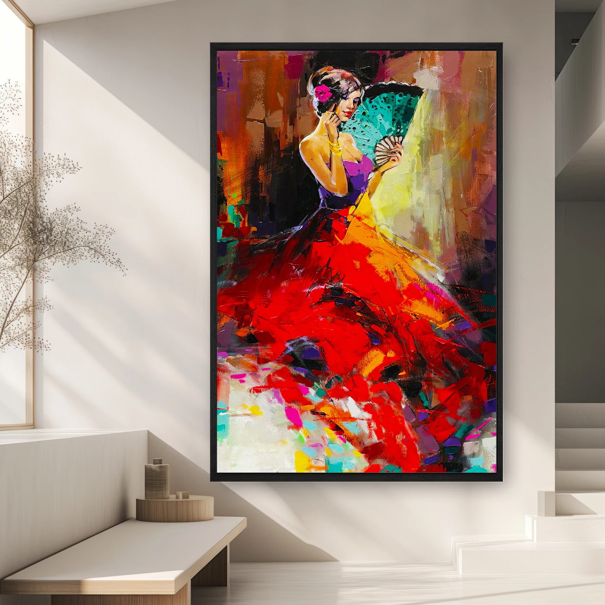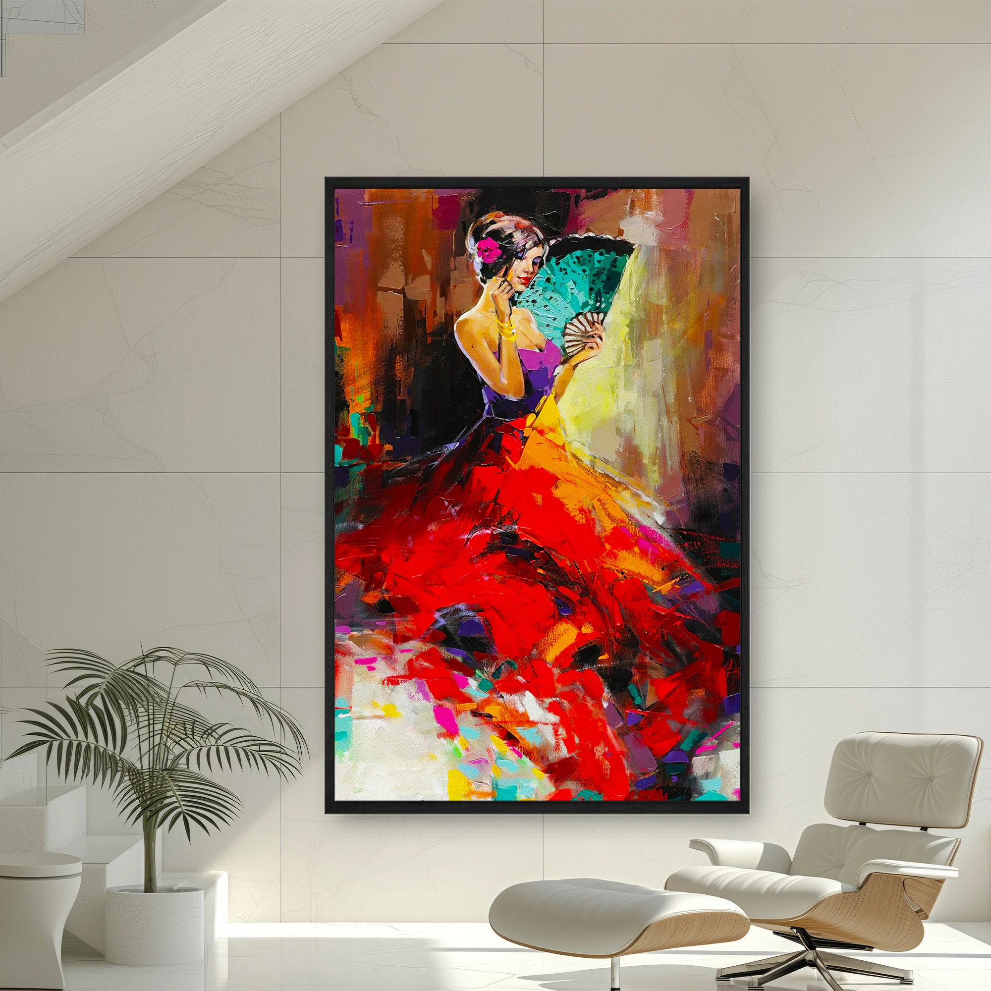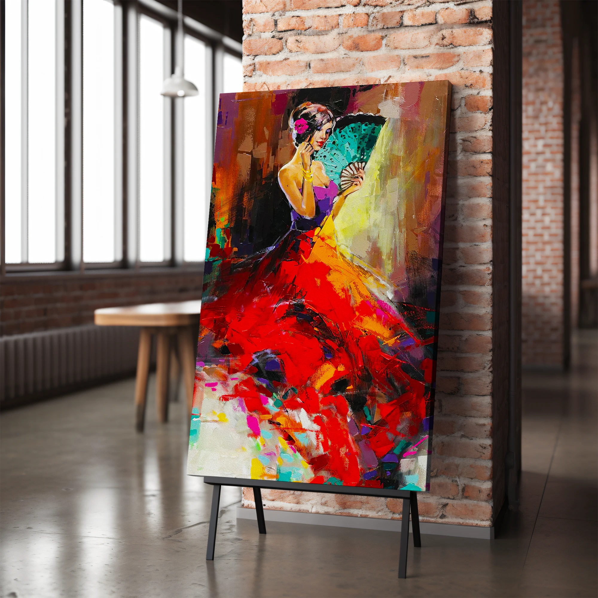 Fan Tutan Kırmızı Bir Elbiseli Bir Kadının Yağlı Boya
