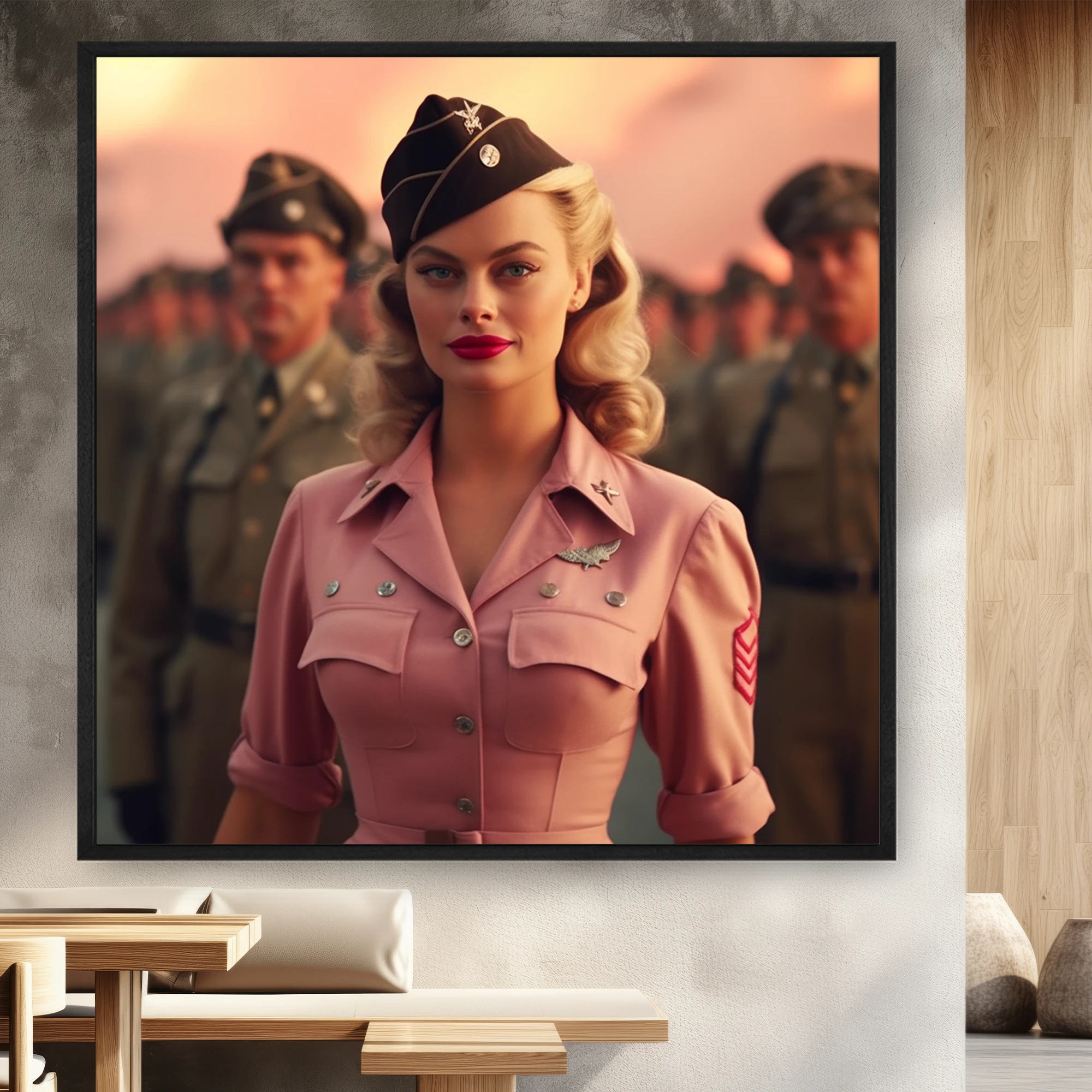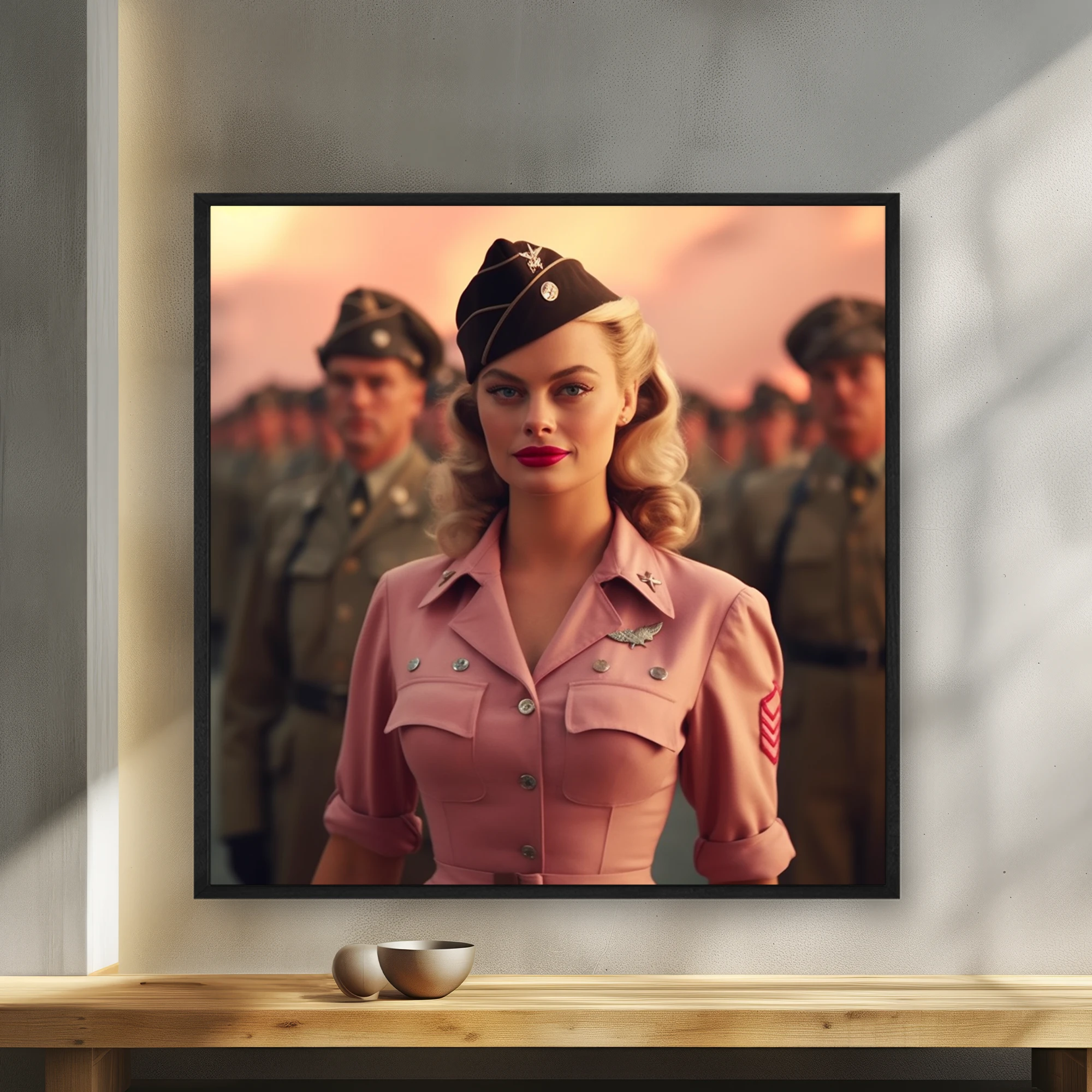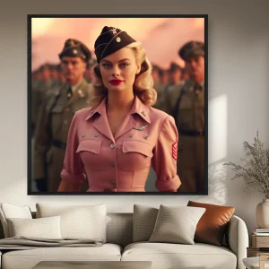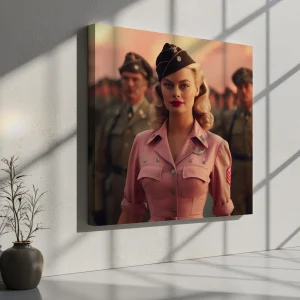 Pembe Üniformalı Sarışın Saçlı Kadın Bir Asker Dizisinin Önünde Duruyor